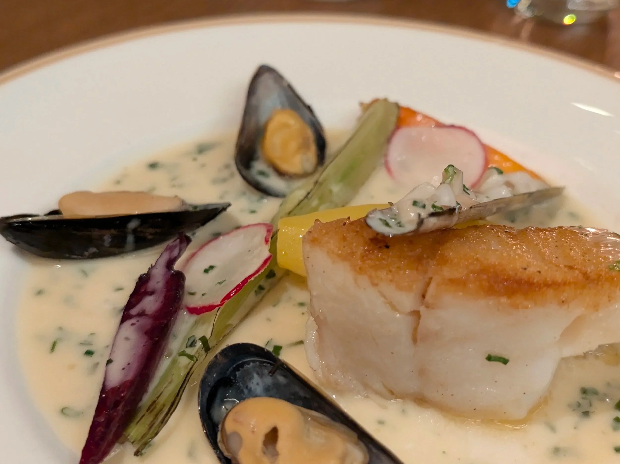 Cod fish with mussels served at Brasserie Marie Amsterdam